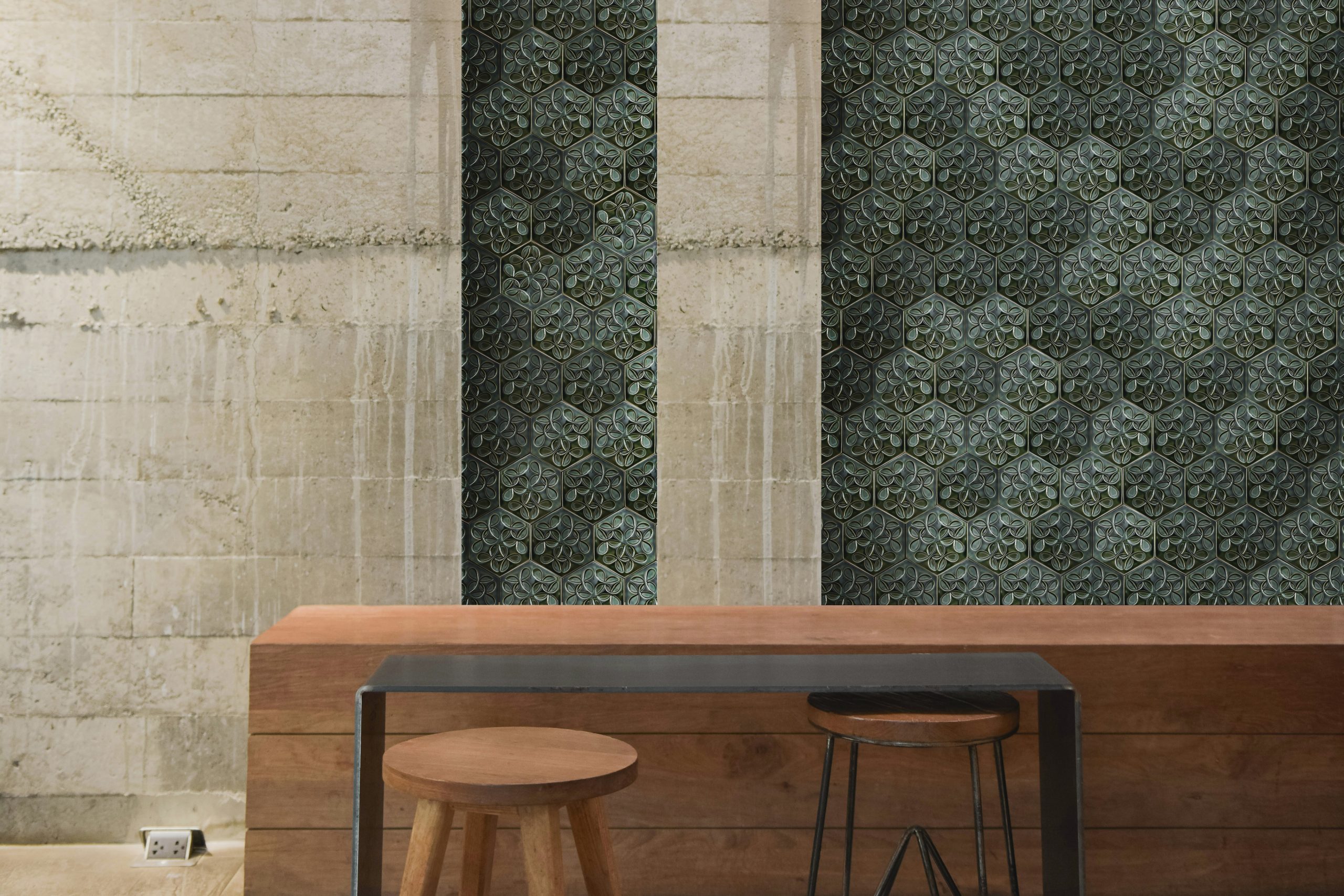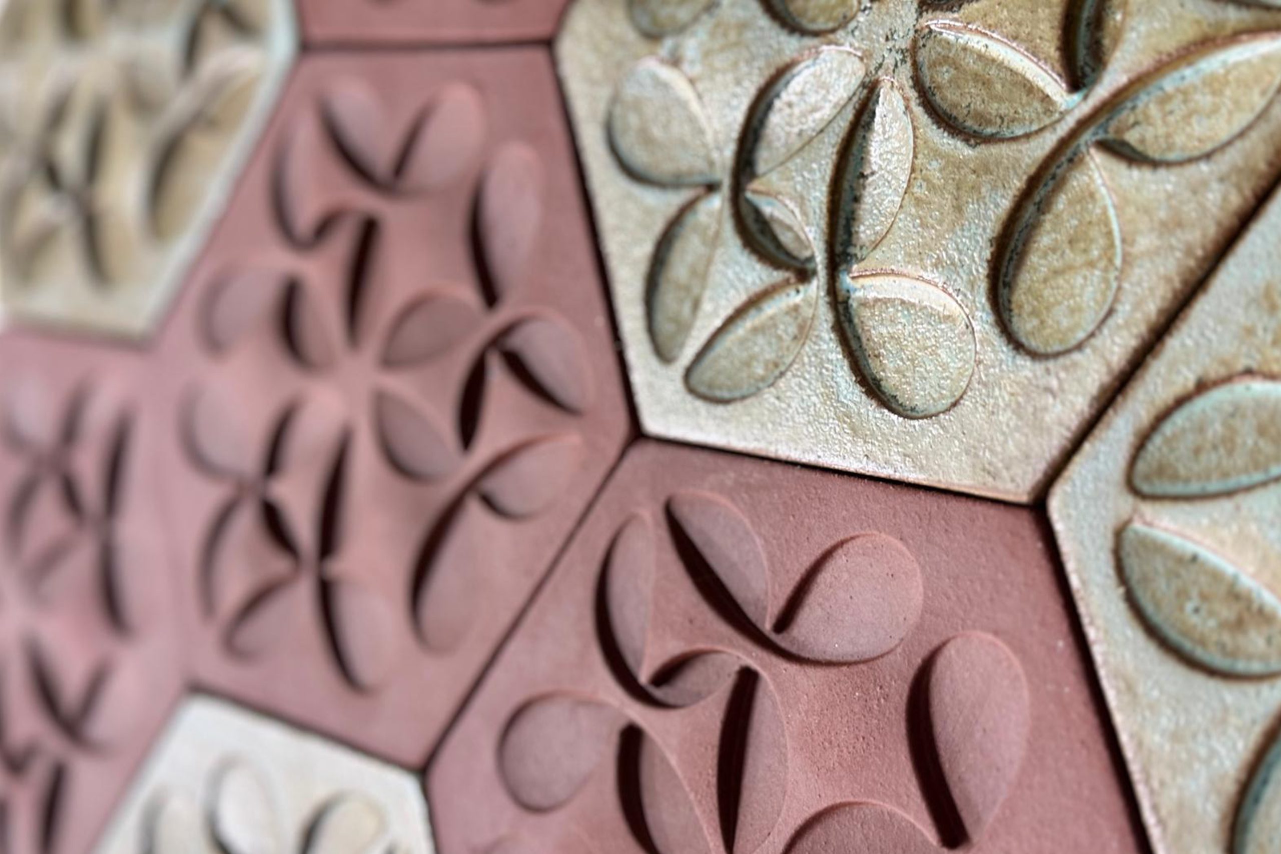 Anu tiles are produced in dimensions of 16.4 × 14.4 × 1.4 cm. They are suitable for use in wet areas, outdoor spaces, and on walls. The Flower of Life pattern is three-dimensionally applied onto the surface of the tile. Masse options can be selected from the color palettes, and glaze options are also available upon request.